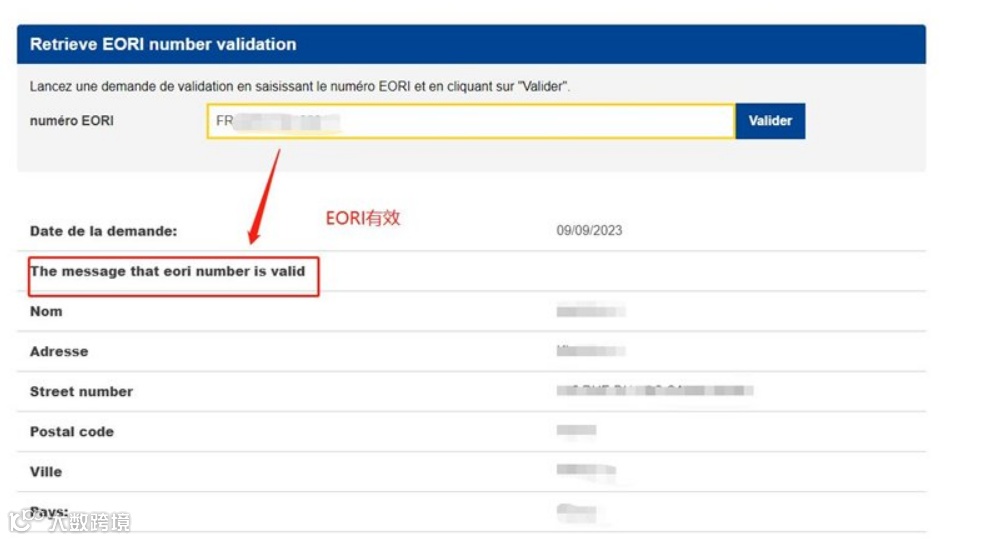 (2)查询结果【有效】则显示:The message that eori number is valid
