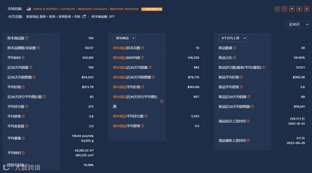 接着看六个月之内上架的品被判定为新品,那么新品数量占了整个类目的比例是29个链接,而且29个链接平均的价格都是300美金左右,最近30天的销售额也是19,000美金,首次上架的时间是最近一个月之内上架的。这些新品数据而言,对于我们产品在刚上架的时候是有一定概率去获得去抢占到不错的市场份额。
