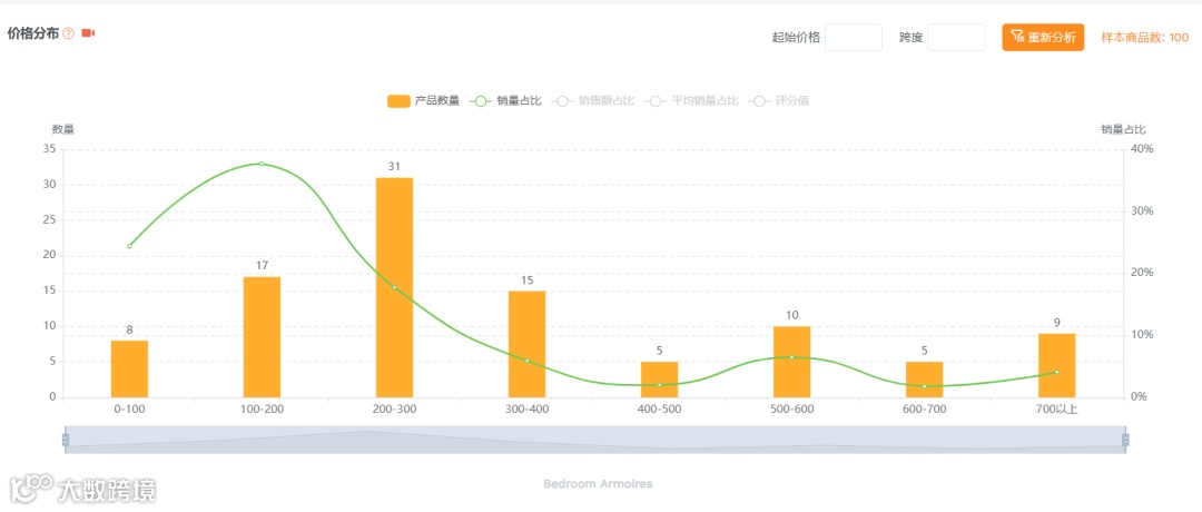 一般来说,我们可以通过市场的价格分布维度去分析在哪个价格区间是占据主要的市场份额比例。可以看到这个类目里面200-300美金占据了主要的比例,那么切入市场时大家如果想做常规的价格区间(不考虑非要做高端或者低端),可以参考200到300这个区间,或者说300-400的一个比例。如果想要做高端可以考虑500+, 考虑低端就是100以内,也一目了然可以看到这个不同价格区间占据的市场比例。