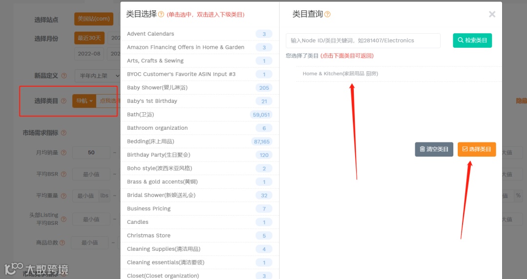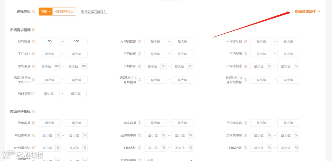 2.接着去选择一个我们的目标类目,我这边的话就以家居类目为例,点击展开过滤条件可以看到过滤条件,上面有三个大的市场需求的指标和维度那么美,接下来依次分析下。