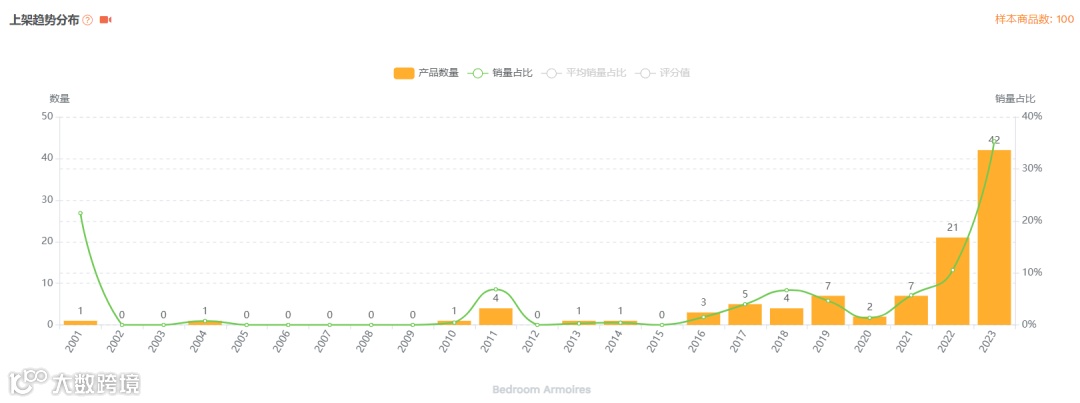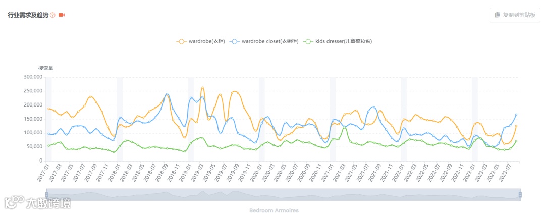 可以明显看到绿色线条kids dresser,其实是处于一个比较平稳的发展,但是整体搜索量是比较小的,市场也小一些。橙色部分波动比较大,在21年和22年的时候属于体量比较大的市场,最近一年市场体量逐渐下降,甚至到后面不及开始时候的一半。蓝色部分相对来说还算平稳,虽然中间有所下滑,但是最近又开始攀升需求量。