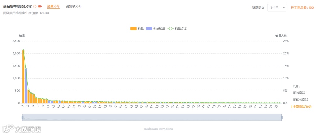 那么产品的链接推广过程中,能否在前100名占据一席之地,这个指标作用很大。它的含义是头部商品的总销量占样本范围内总销量的比例。意思就是: