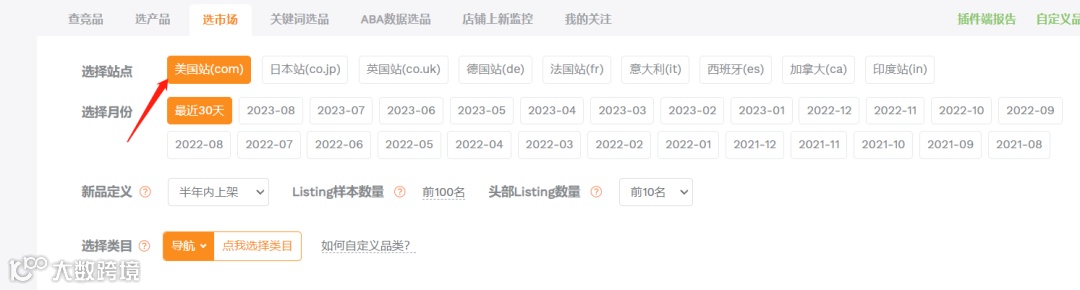 1.我们先选择目标站点,比如说我这边主要是做美国站,那么就以美国站为例,接下来选择最近30天。