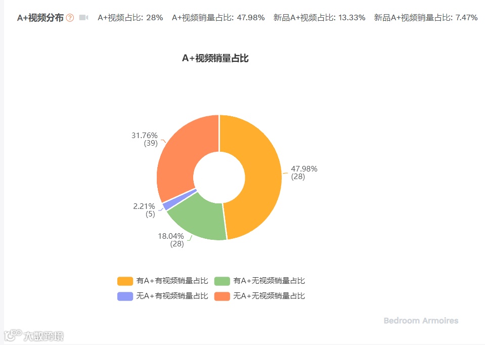 关于A+视频分布的板块,可以看到市场里面有A+和视频,还有没A+没有视频市场占比的数据变化。通过上面数据可以看到, 普遍来说有A+和视频的链接占据市场份额比较大,那么对于新卖家来说,我们在做listing的时候尽量都要上传,不然很难和其他卖家竞争。