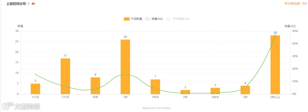 上架时间分布,可以反馈出整个类目里面有多少新品的链接以及占到的新品占到的市场份额。我可以直接看到虽然新品数量多,但是市场份额占比还是很少,说明新品进入这个市场比较容易进入前100名,但是进入前100名后也没有抢到多少的销量。