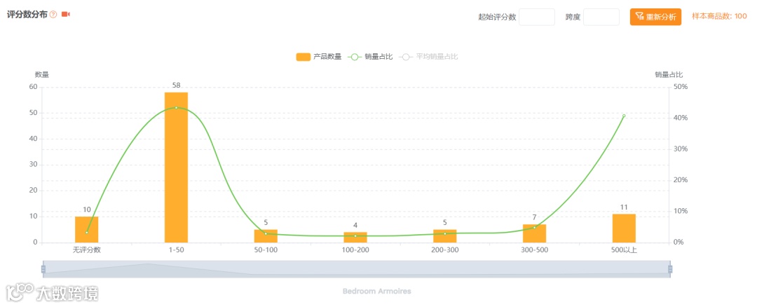 评论数量其实是越低越好,评分的数量越低证明我们不需要很多的评论数量就可以进入到前100名,从而获取一定订单量,那么看一下这个市场的一个情况1-50个评论的数量是最多的,那么我们在新品上架的时候不需要几百个评论,可能二三十个评论就可以进入到整个类目的前100名。