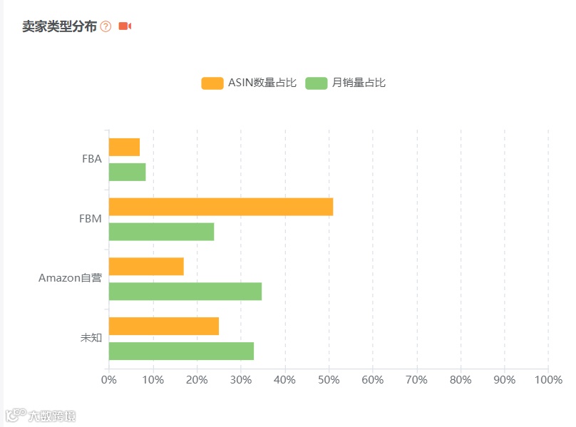 卖家类型分布的情况分为FBA,FBM,亚马逊自营。