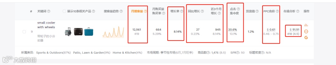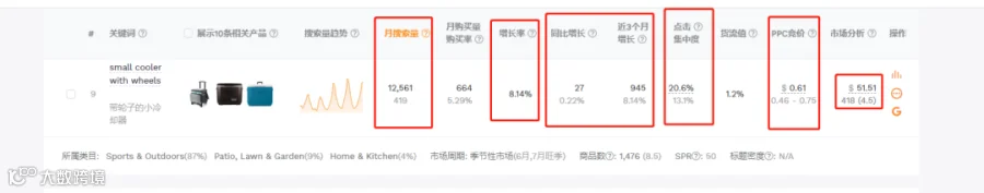 带轮子的小冷却器, 月搜索量是1W2左右, 属于偏小型的细分市场,增长率为8%, 并且最近3个月的增长比例也维持在8%, 算是近期都处于不错的增长趋势内。