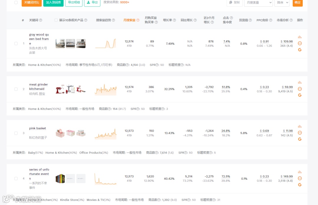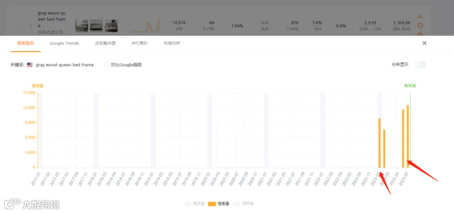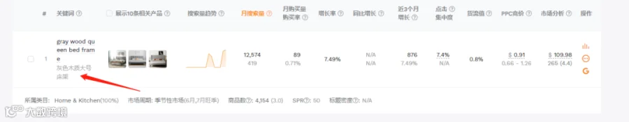 可以分析关键词所代表的细分市场,看一下数据表现,首先是gray wood queen bed frame灰色木质大号床架。
