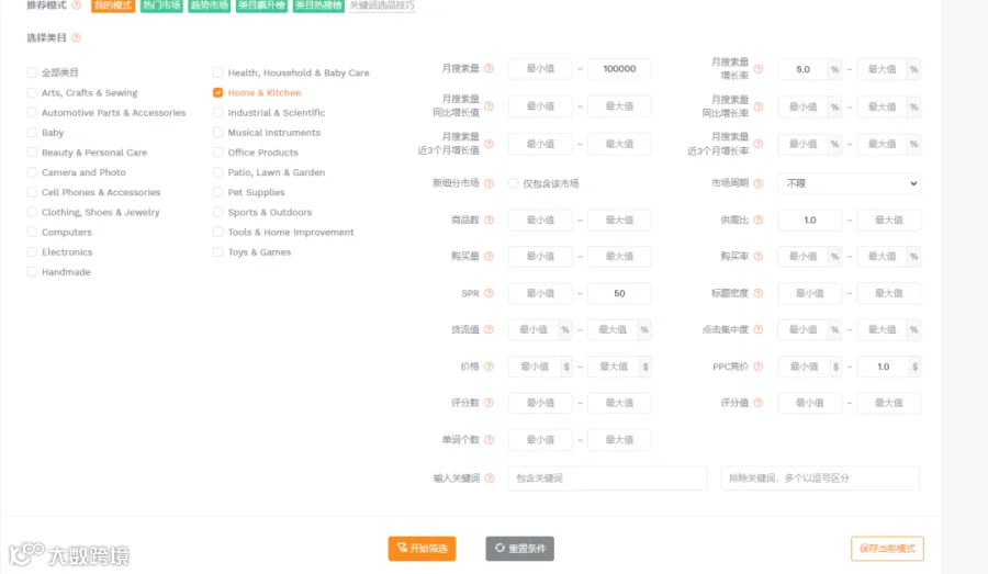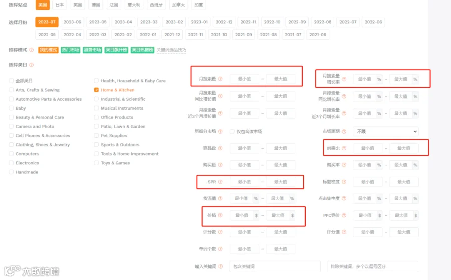 1.借助卖家精灵的关键词选品功能,然后输入几个关键性指标: