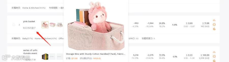 3.接着是“粉红色”收纳筐这个细分品类: