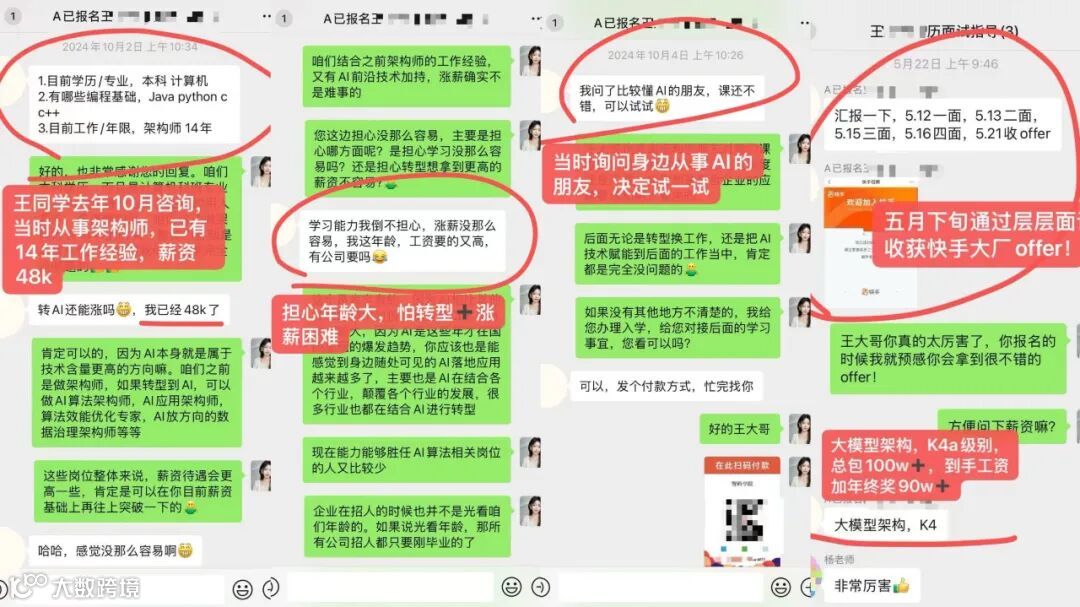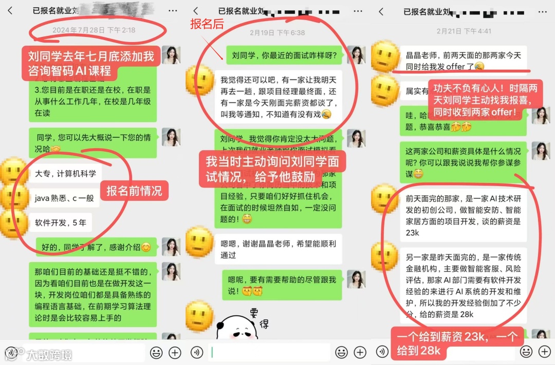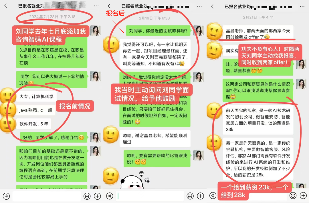 常同学转型前做网络安全8年,基础一般,也担心没有AI经验,那时即将被裁员,经过多番了解,常同学也明白AI对于想要转型的人员来说是机会更多的方向,最终得到家人的支持加入学习,结果也并没有让他失望,在成都收获26k15薪的offer!