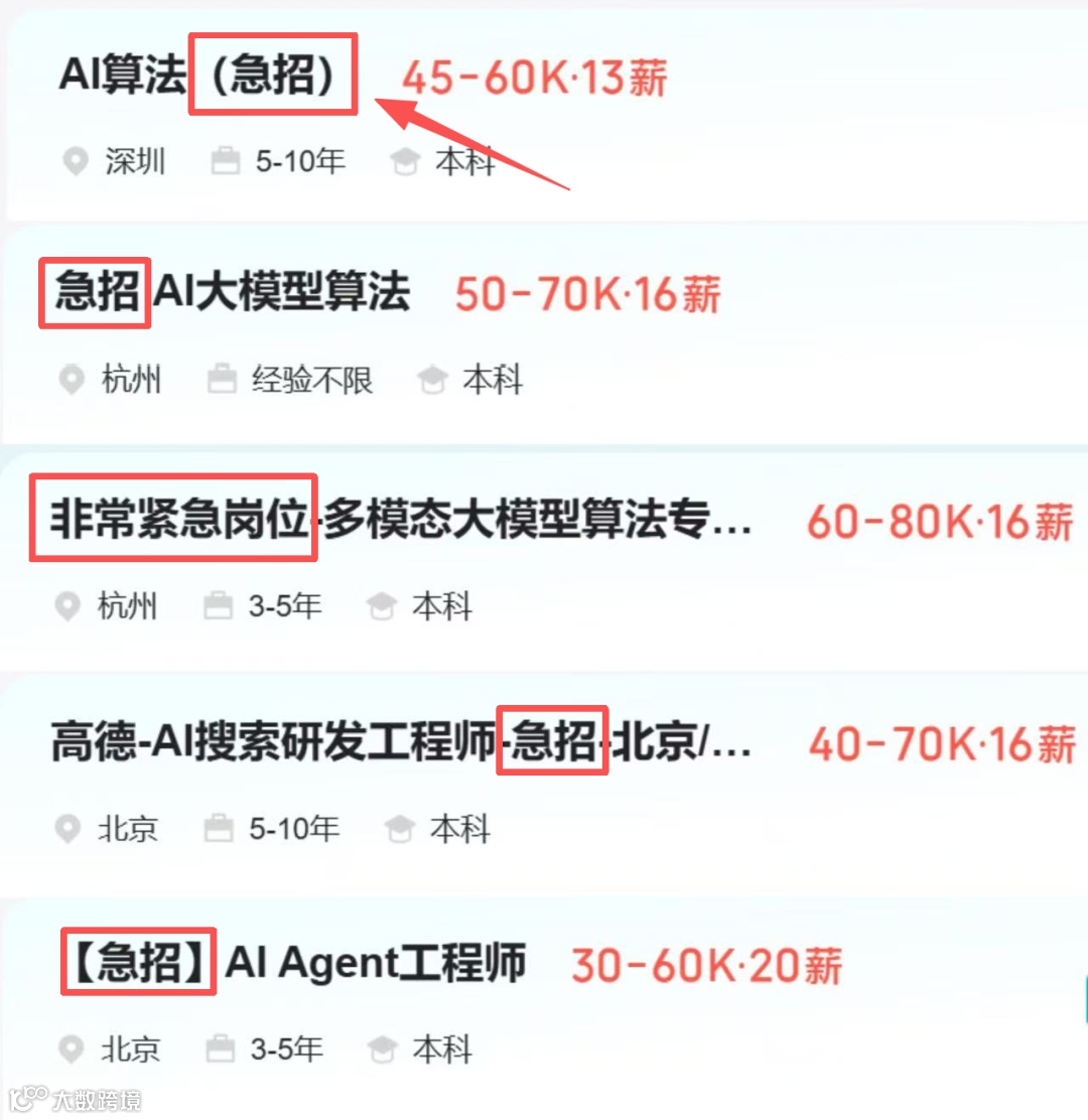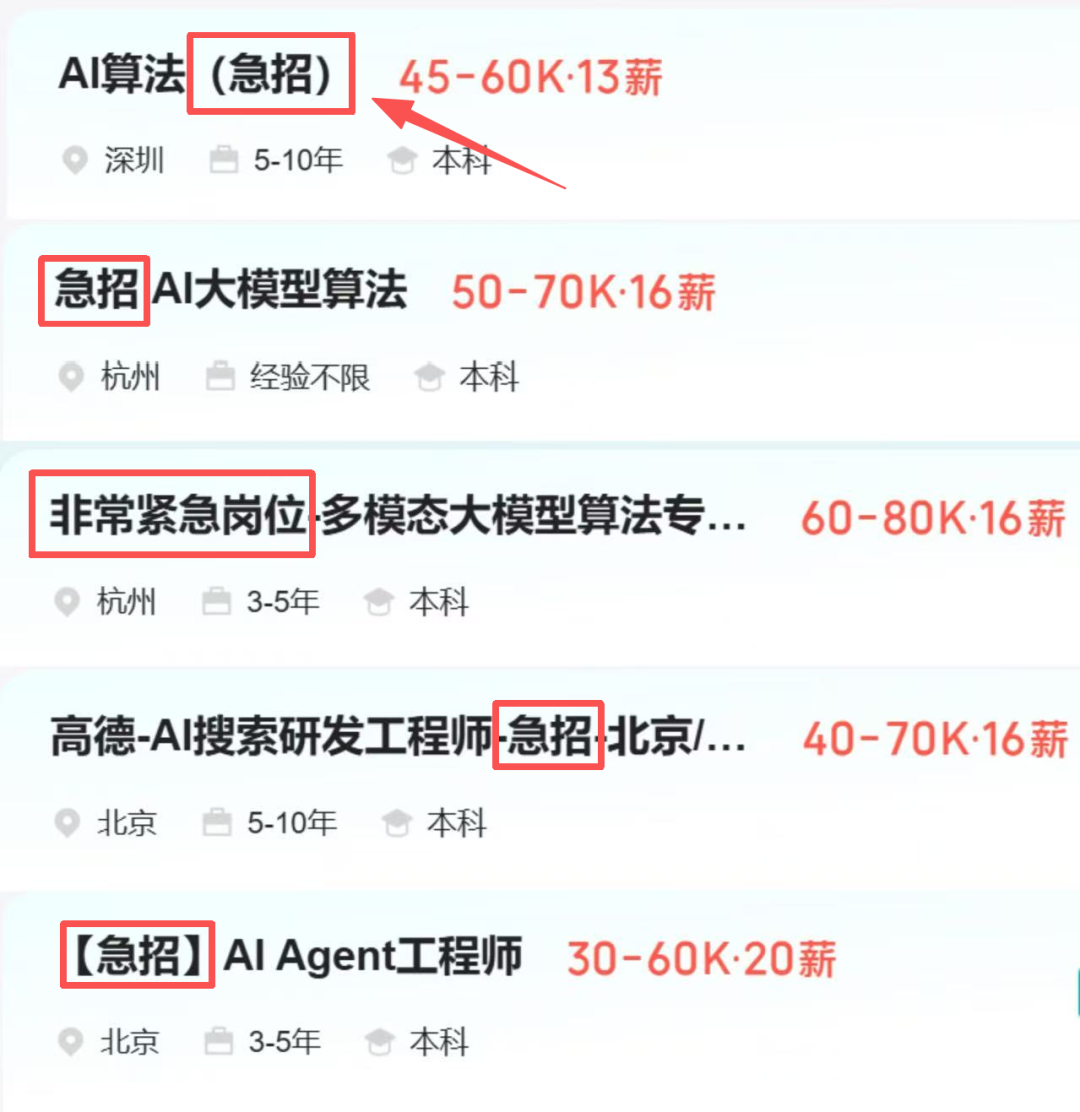 与此同时,我发现97%以上企业开高薪岗位“紧急招聘 “Agent工程师、大模型应用开发、AI算法,年薪60万-150万!!但合适的人不到5%。