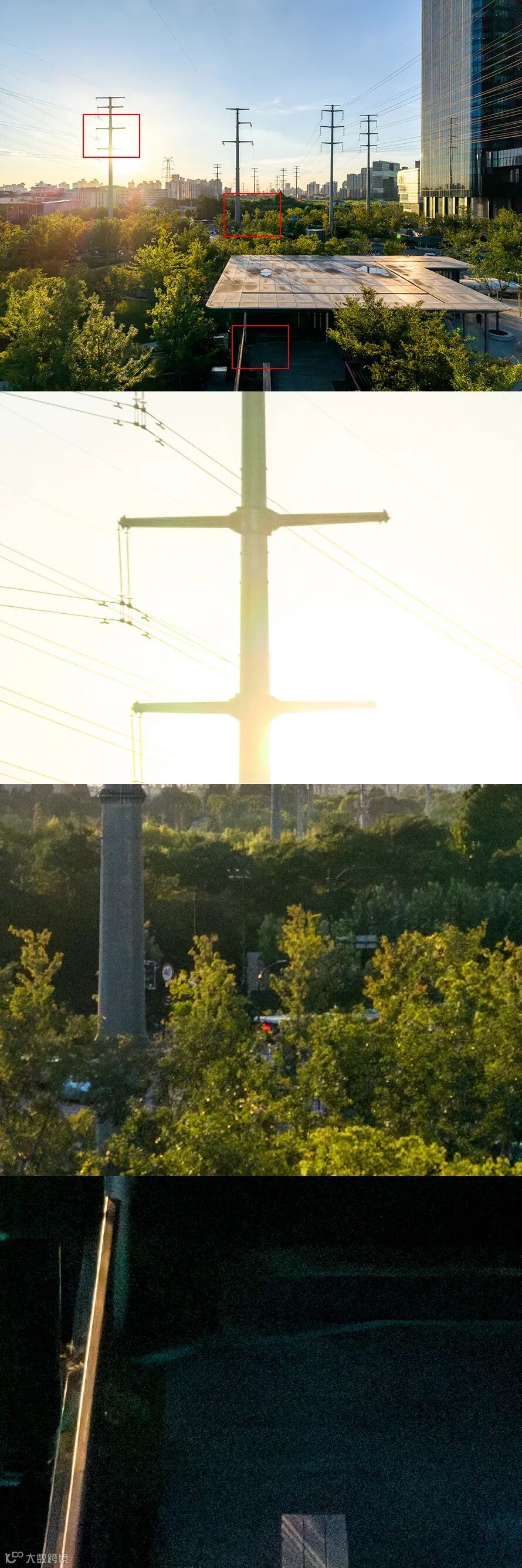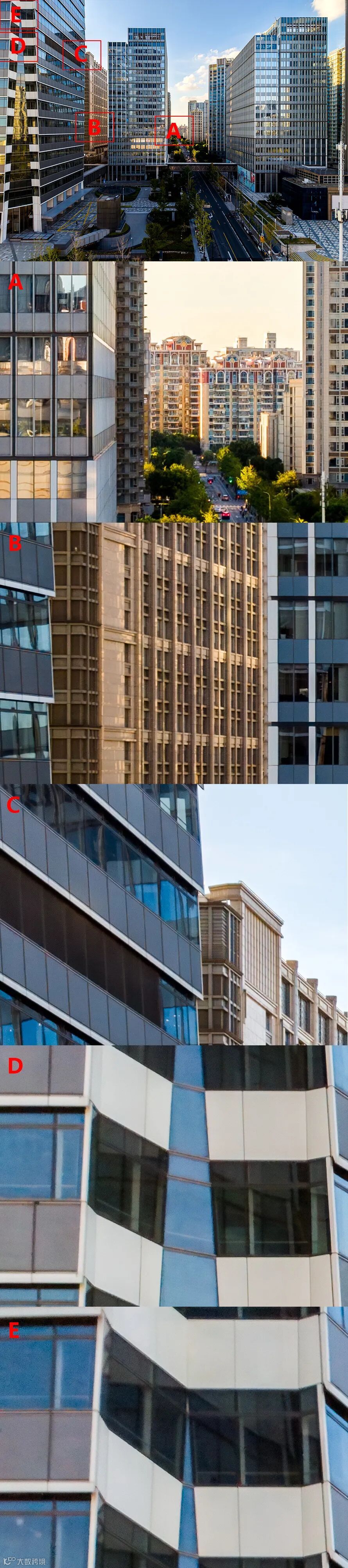 上面首图是DJI Mini 5 Pro拍摄顶部全图,A、B、C、D、E分别对应的是画面中心、1/2成像圈位置、2/3成像圈位置、16:9下的边角、边角。对于DJI Mini 5 Pro的小镜头来说,中心到1/2成像圈位置之间锐度是不错的,但是从2/3成像圈位置开始锐度存在一定下滑。需要强调的是这是基于50MP下的测试,如果是拍摄12MP照片或是4K视频,镜头边缘分辨率表现还是相当不错的。