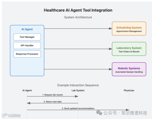 AI代理经常依赖于外部工具,如医院信息系统API或处理实验室工作流程的机器人设备。通过调用结构化命令,代理可以自动化安排或获取更新的实验室结果,而无需强制临床医生导航多个平台。