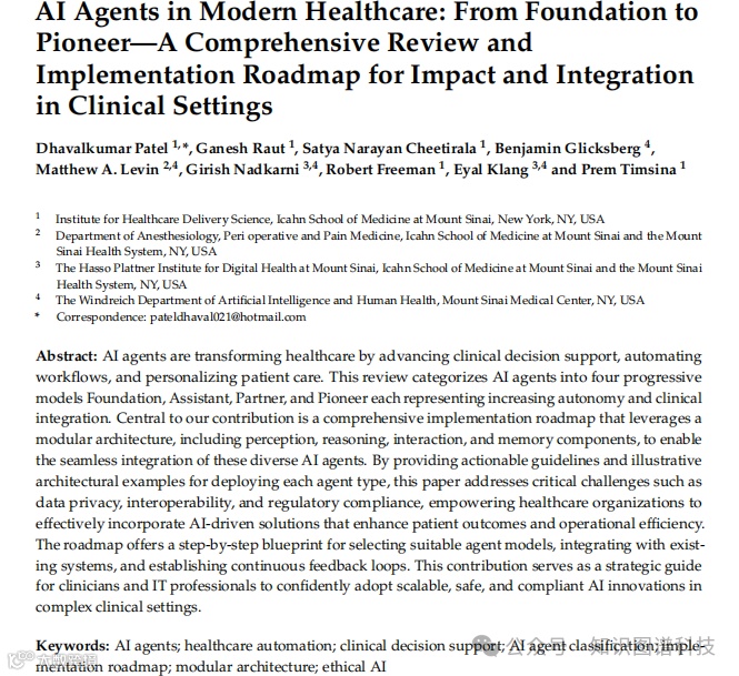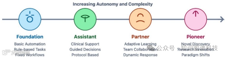 :论文将AI代理分为四个渐进的模型:基础代理、助手代理、合作伙伴代理和先锋代理,每个模型代表了不同的自主性和临床整合程度。 - 实施路线图