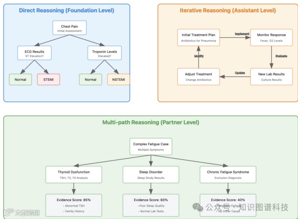 推理模块复制了临床医生在形成和测试假设、解释临床数据和修订管理计划时的过程。推理模块从直接推理到迭代推理,再到多路径推理,逐步复杂化决策过程。