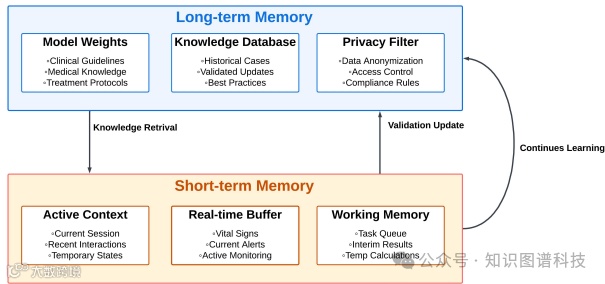 代理的记忆模块对于跟踪患者遭遇、临床数据和机构政策至关重要。长期记忆被结构化为三个关键组件:模型权重存储临床指南和治疗协议、知识数据库维护历史病例和验证更新、隐私过滤器确保数据匿名化和合规性。短期记忆保持与单个患者交互或特定护理事件相关的上下文细节。