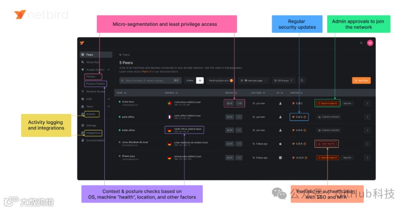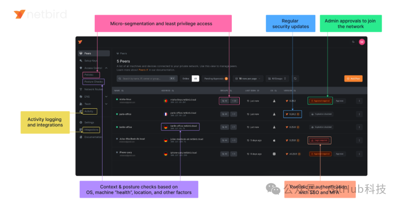 连接。NetBird 创建一个基于 WireGuard 的覆盖网络,该网络通过加密隧道自动连接您的机器,省去了打开端口、复杂的防火墙规则、VPN网关等麻烦。
