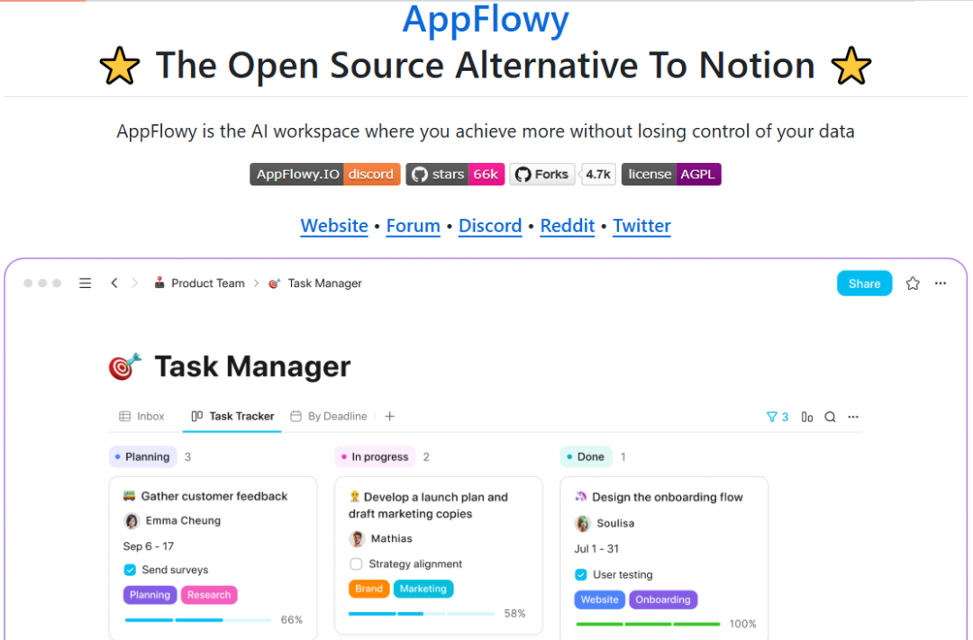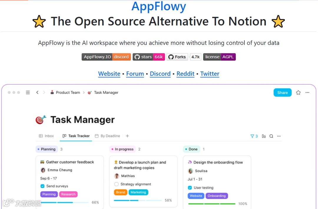 AppFlowy 是一个开源任务管理工具,用户可以在这个平台上轻松管理任务、创建待办事项列表、设定截止日期、跟踪事件,并添加页面以及格式化文本。此外,AppFlowy 还提供了可视化数据库功能,让用户可以在不同阶段中移动项目,或根据属性进行分类。通过看板功能,用户可以清晰地定义项目范围,并以直观的方式展示和分析数据。同时,AppFlowy 还支持强大的 OpenAI 写作功能,用户可以从中获得写作支持,包括初稿编写、改进文字、修正拼写错误和生成摘要等功能。