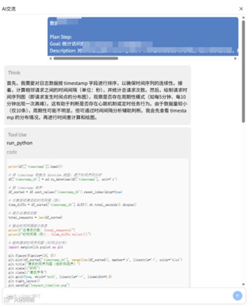 围绕问题主机是否与外部ip存在心跳连接,分析智能体会编写python代码围绕日志的发生时间进行统计维度的分析,判断其是否有周期性规律,并对一些关键发现绘制图表进行展示。同时也筛选一些关键的可疑日志进行一一“细看”,最终输出分析报告。