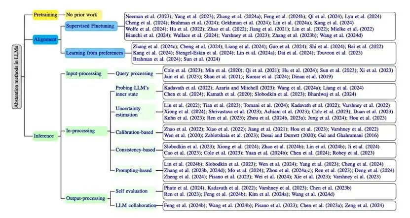 将推理阶段的方法分为三类:输入处理(input-processing)、过程内处理(in-processing)和输出处理(output-processing),具体取决于这些方法应用的时间点。输入处理方法主要从问题可回答性和人类价值观的角度出发;过程内处理方法主要从模型知识的角度出发;而输出处理方法则同时考虑模型知识和人类价值观。