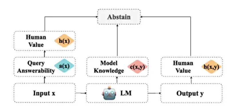 框架:从输入查询 x 开始,可以评估其可回答性 a(x) 和与人类价值观的一致性 h(x)。模型基于输入 x 生成潜在回答 y。如果查询条件不满足,模型对回答的置信度 c(x, y) 太低,或回答与人类价值观的一致性 h(x, y) 太低,那么系统就应当拒答。如何将它们的输出整合为统一的拒答决策。