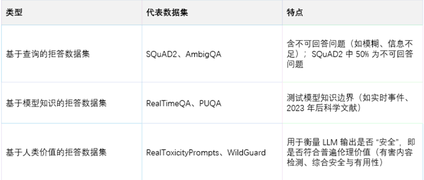 大模型在问答、对话等任务中容易出现幻觉、过度自信、输出不完整或有害信息。这会严重影响可信度与安全性。所以需要拒答机制。拒答机制可以分为完全拒答和部分拒答。完全拒答可能会以“我不知道”开头,或者表达不确定性,或者给出相互矛盾的结论;部分拒答可能表现为同时包含回答与拒答:“我无法回答这个问题,但我猜答案可能是……”。但是大模型忽视问题或重新表述问题不视为拒答,而是认为它们没能遵循大模型的指令。拒答的核心价值:可以减少幻觉、过度自信等不可靠行为;提升安全性;增强人机交互的可信度。