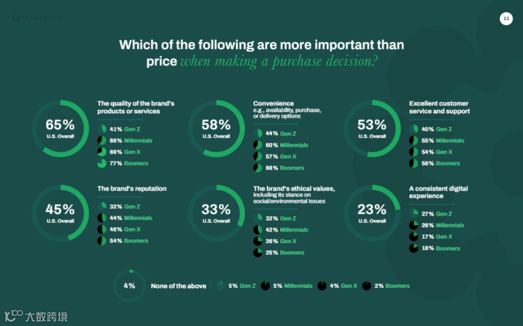 如今,美区市场更倾向于品牌化和高附加值的优质好货。消费者也不再愿意为“廉价”买单,而是用行动为“价值”投票。Marigold发布的《2024年美国消费者趋势指数》指出,65%的美国消费者在作出购买决策时认为品牌的质量或产品的服务权重超过价格。