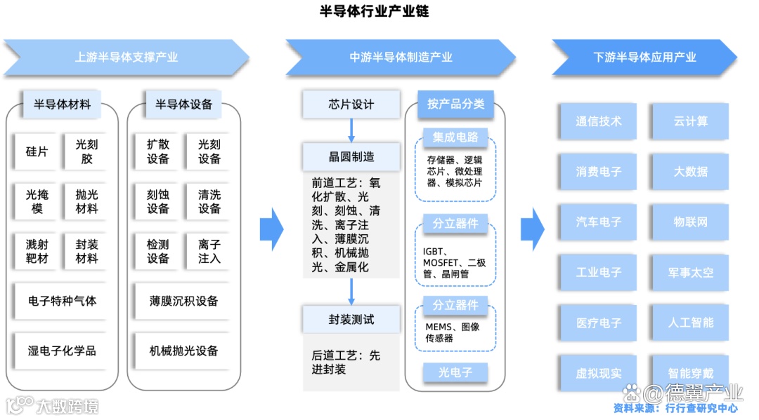 上游领域中,原材料与设备是产业基石。半导体材料方面,硅片占芯片总成本 30%-40%,全球前六大厂商占据 80% 市场份额,国内沪硅产业、中环股份等企业正加速追赶;电子特气、光刻胶等关键材料国产化进程加快,华特气体、南大光电等厂商在细分领域实现突破。设备领域,光刻、刻蚀、薄膜沉积等核心设备技术壁垒极高,国内北方华创、中微公司、拓荆科技等企业已在刻蚀、沉积等设备领域形成竞争力,为产业链自主可控奠定基础。