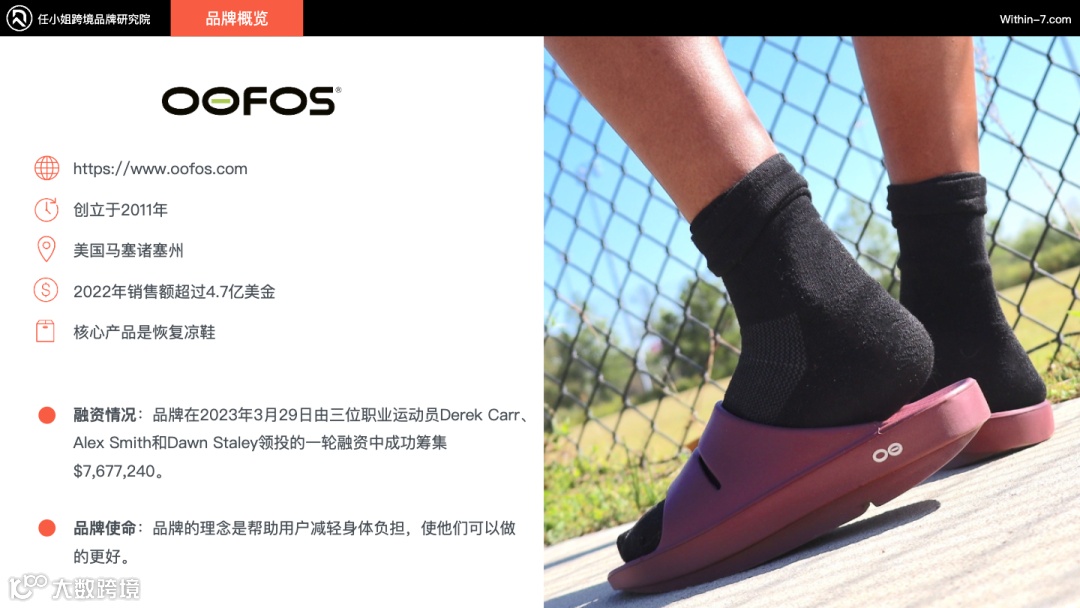 oofos恢复鞋品牌,创立于2011年,来自美国马塞诸塞州。2022年销售额超过4.7亿美金。核心产品是在行走时能够减轻压力的恢复凉鞋。