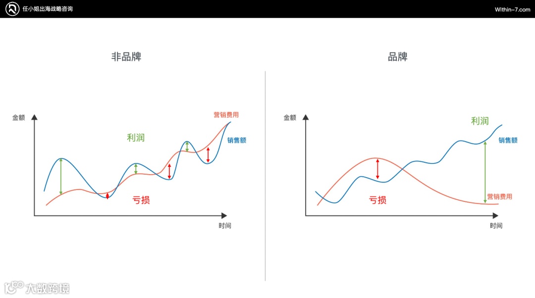 大家可以从上图看到,无品牌的利润空间会很小,营销费和销售额会随着时间逐步上升,并且因销售额不稳定,存在营销费用打不平的情况;有品牌的利润空间会很大,营销费用会随着时间逐步下降,销售额逐渐趋于稳定上升期;