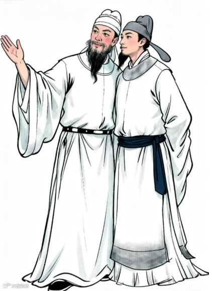 画面:左侧身着白衣、头戴白色头巾的人(参考第一张图形象)微笑着挥手,右侧身着白衣、戴灰色帽子的人(参考第二张图形象)也挥手回应,两人距离较近,氛围轻松。