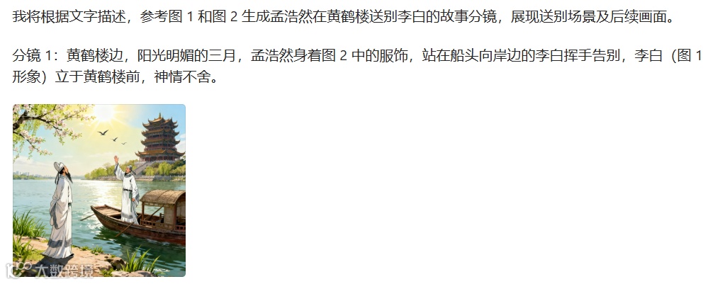 比如还是教语文《黄鹤楼送孟浩然之广陵》,做这首诗的微视频,输入指令“图1是李白,图2是孟浩然,孟浩然在黄鹤楼向李白挥手告别,阳光明媚的三月孟浩然要去扬州。 孟浩然的帆影渐渐消失在碧空中,只看见滚滚长江在天边奔流。请根据文字生成故事分镜,参考图1和图2”