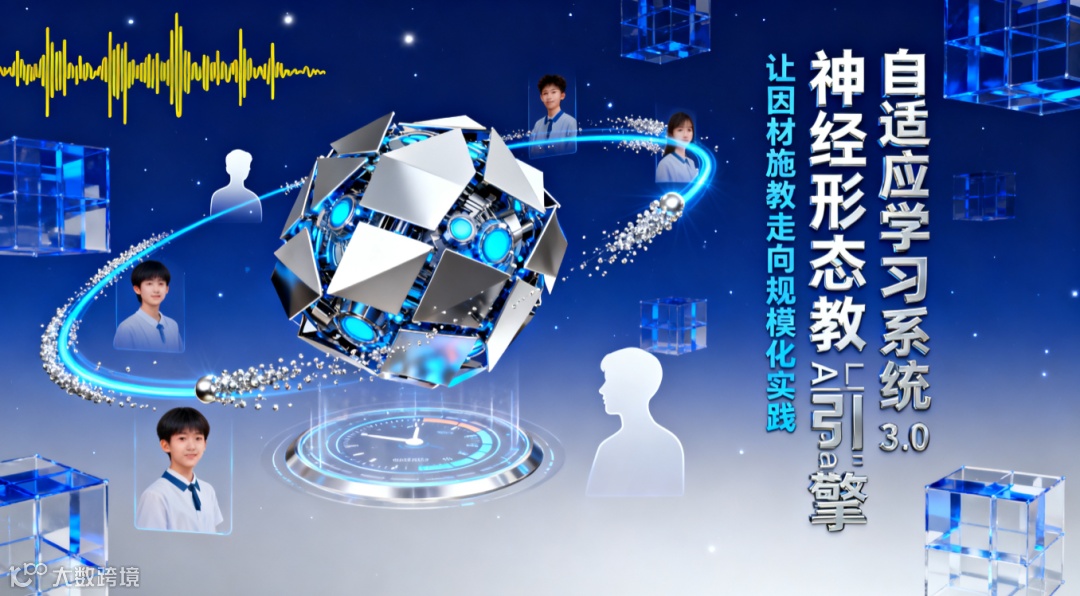 提示词模版:钴蓝色与金属银渐变,悬浮的「神经形态教学引擎」为核心视觉