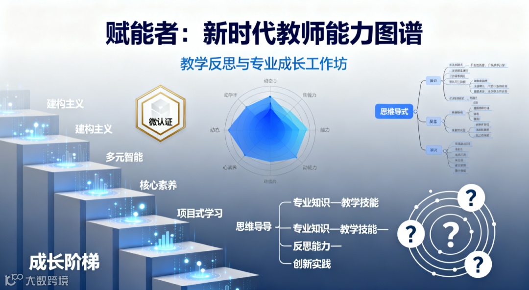 提示词模版:柔光蓝灰渐变背景,左侧搭建由教育理论关键词构成的「成长阶梯」,每个台阶嵌入教学成果数据光点,右侧悬浮发散状思维导图