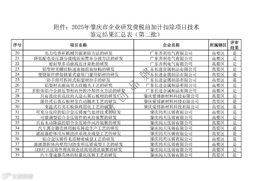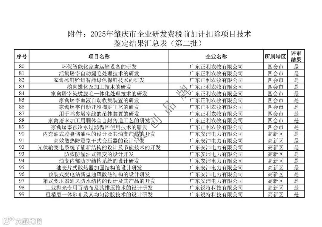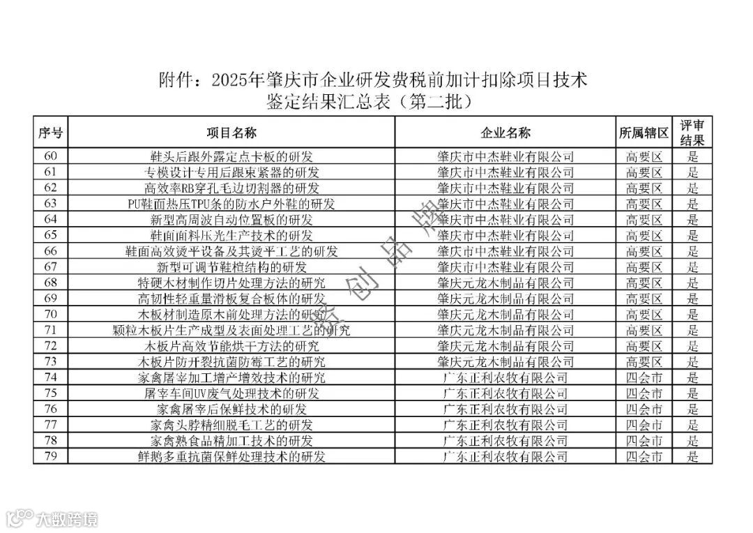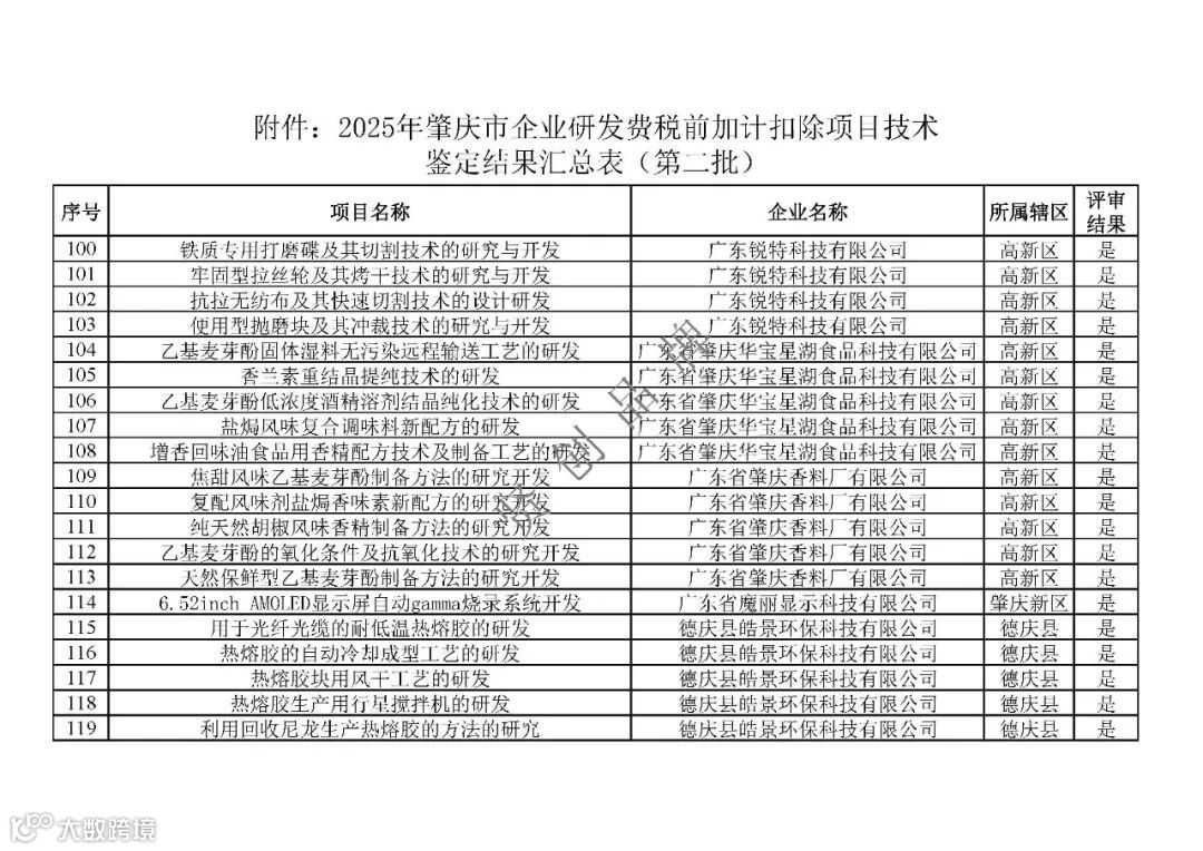 根据《广东省科学技术厅 广东省财政厅 国家税务总局广东省税务局关于印发〈关于深入推进企业研发费用税前加计扣除政策落实的若干措施〉的通知》(粤科政字〔2021〕7号)要求,我局开展了2025年第二批企业研发费税前加计扣除项目技术鉴定工作,对企业自主申报以及市税务局转请的项目进行技术鉴定,经专家评审,现将鉴定结果予以发布。