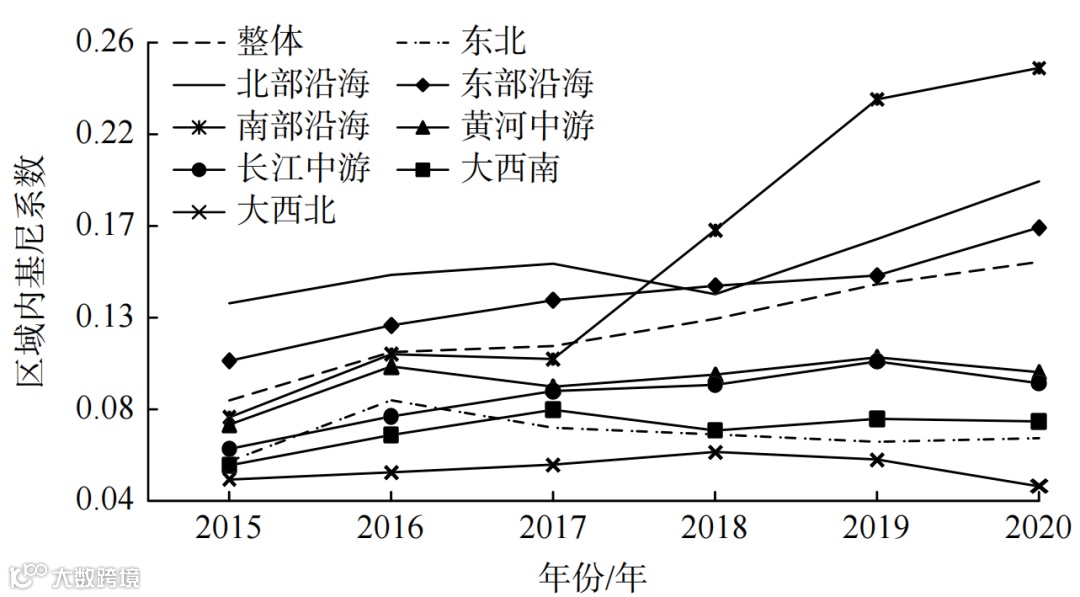图4展示了8大地区国家高新区开放创新水平的区域内基尼系数。
