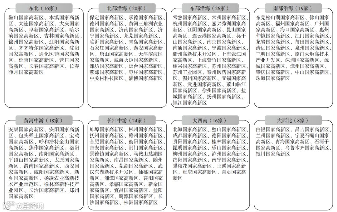 结合区域协调发展战略和参照已有研究做法,将国家高新区按照其所属的区域划分为东北、北部沿海、东部沿海、南部沿海、黄河中游、长江中游、大西南、大西北这8大综合经济区(8大地区)的国家高新区(图1)。我们所有国家高新区数据均来自于国家统计局与科技部火炬高技术产业开发中心的统计数据。