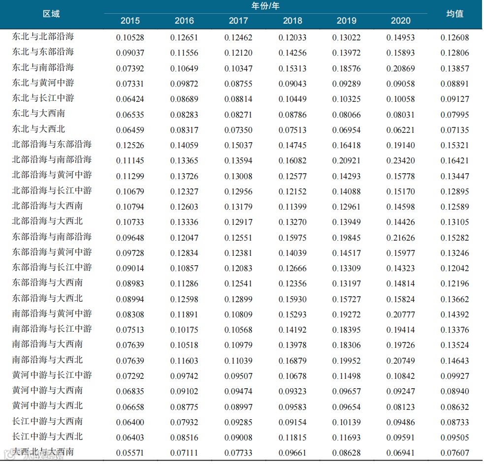 就年均增长率而言,南部沿海国家高新区与东北、大西北、黄河中游、长江中游、大西南、东部沿海、北部沿海国家高新区开放创新水平能力的区域间差距增速较快;东部沿海国家高新区与大西北、东北、黄河中游、大西南国家高新区开放创新水平区域间差距的增速次之。大西北与大西南国家高新区、东北与黄河中游国家高新区、黄河中游与大西北国家高新区、东北与大西南国家高新区、东北与大西北国家高新区开放创新水平能力的区域间差距增速相对较慢。8大地区国家高新区开放创新水平的区域间差距均呈现出了扩大态势。