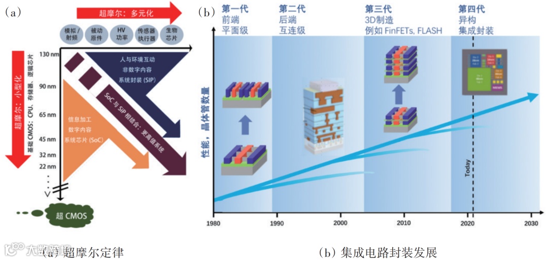 1965年,Gordon在《电子学》杂志发表《Cramming more components onto integrated circuits》,提出了著名的摩尔定律(Moore's Law),即单位成本下,芯片集成的复杂程度将以每年2倍的速度增长。1975年,Moore对此定律进行了修正,认为在爆发式增长后芯片的集成复杂度将减缓到每2年翻一番,而造成这种局限的原因是由于集成电路以及器件的精细度受局限导致的。因此,芯片集成的复杂程度比芯片面积或引线尺寸对器件性能提升的影响更大。随着现代高端电子产业的发展,国际半导体技术蓝图(International Technology Roadmap for Semiconductors,ITRS)在2005年提出了“More than Moore”的概念,如图1(a)所示,即为了满足更低功耗、更高效率、更快速度的应用需求,Moore定律已经不再适用于现代高端电子器件制造,因此更复杂的芯片集成方式应运而生。