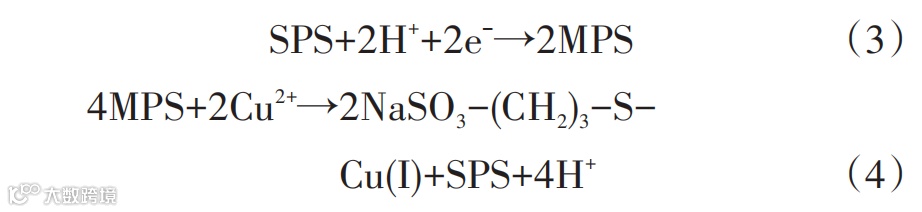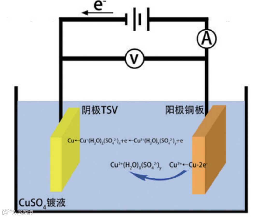 如图3所示,一般在电镀时以可溶性铜板或不可溶金属板作为阳极,TSV基板作为阴极,通过施加外界电场,在阴极TSV种子层上还原电镀液中的Cu2+使Cu填满整个TSV深孔的过程即为TSV电镀金属化。在此过程中,以硫酸铜电镀液为例,Cu2+发生的还原反应: