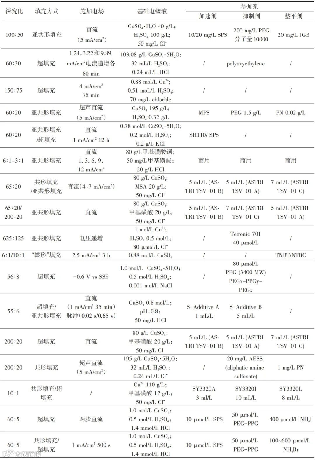 电镀液中添加剂的选择与配比作为TSV的核心技术是目前研究的重点问题。大部分电镀液体系中除了基础镀液外,主要的添加剂是加速剂、抑制剂以及整平剂。添加剂的存在可以改变铜的填孔方式,使TSV的无缺陷填充成为可能。目前TSV电镀添加剂供应商有乐思、陶氏杜邦、安美特等国外企业;上海新阳、深圳创智成功等国内企业也正在积极研发验证当中,目前尚未有批量应用。表1介绍主要添加剂的种类及各自的特点。