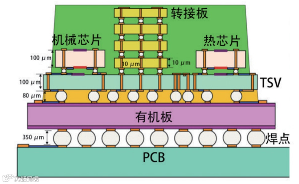 所谓TSV,即穿透Si晶圆实现各芯片层间电气互连的导电柱,是继引线键合、载带自动焊和倒装芯片后的第四代互连技术。图2为一个3D集成电路(3D Integrate Circuit,3D IC)的横截面示意图,由一个包含4个存储芯片的转接板(interposer)、4个存储芯片、1个热芯片和1个机械芯片组成。