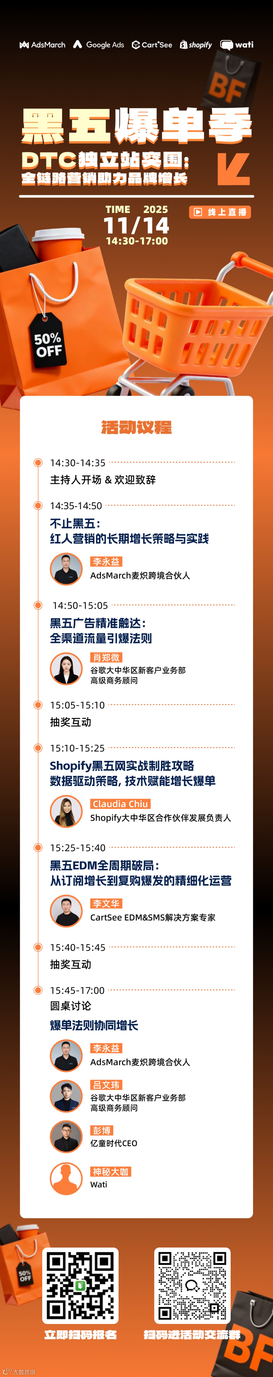 圆桌论坛《爆单法则·协同增长》将汇聚AdsMarch麦炽跨境合伙人李永益、Google大中华区高级商务顾问吕文玮、亿童时代CEO彭博以及Wati神秘嘉宾四位行业专家。嘉宾们将从不同视角出发,探讨如何在黑五节点实现从流量到转化、从工具到策略的高效协同增长,解密品牌在全球竞争中突围爆单的系统打法。