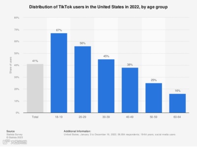 虽然TikTok在青少年中最流行,但TikTok可不仅仅是青少年的独有阵地。在美国,使用群体排名第二的就是20-29岁的人群。