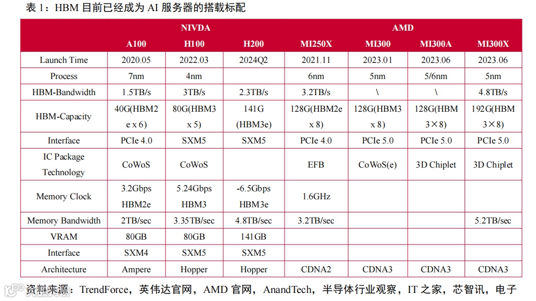 HBM具备高带宽、高容量、低延时和低功耗优势,目前已逐步成为AI服务器中GPU的搭载标配。英伟达推出的多款用于AI训练的芯片A100、H100和H200,都采用了HBM显存。