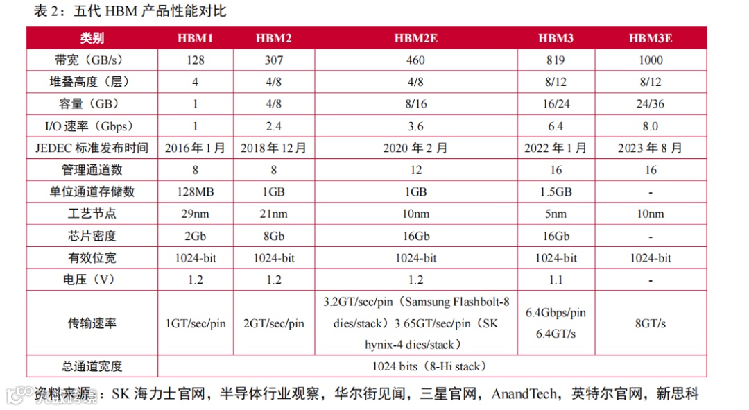 HBM市场竞争激烈,HBM产品向低能耗、高带宽、高容量加速迭代。从2016年第一代HBM1发布开始,HBM目前已经迭代到第五代产品——HBM3e,纵观五代HBM产品性能变化,可以发现HBM在带宽、I/O速率、容量、工艺节点等方面取得较大突破,其中带宽由初代的128GB/s迭代至HBM3e的1TB/s,I/O速率由1Gbps迭代至8Gbps,容量从1GB增至最高36GB,制造工艺则取得进一步突破,达到5nm级别。