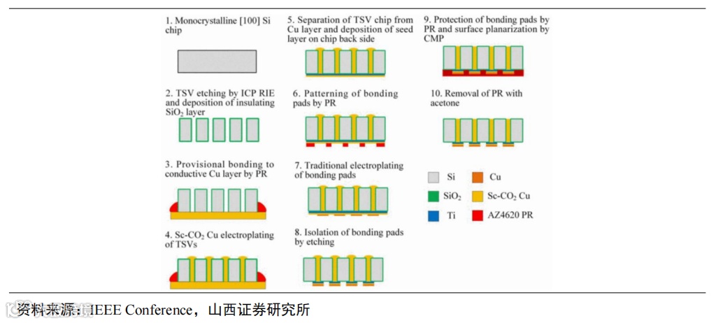 TSV技术主要涉及深孔刻蚀、沉积、减薄抛光等关键工艺。TSV首先利用深反应离子刻蚀(DRIE)法制作通孔;然后使用化学气相沉积(PECVD)的方法沉积制作介电层、使用物理气相沉积(PVD)的方法沉积制作阻挡层和种子层;再选择电镀铜(Cu)进行填孔;最后使用化学和机械抛光(CMP)法去除多余的铜。另外,由于芯片堆叠集成的需要,在完成铜填充后,还需要晶圆减薄和键合。