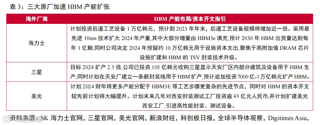 HBM多层堆叠结构提升工序步骤,带动封装设备需求持续提升。(1)前道环节:HBM需要通过TSV进行垂直方向连接,增加了TSV刻蚀设备需求,同时HBM中TSV、微凸点、硅中介层等工艺大量增加了前道工序,给前道检、量测设备带来增量;(2)后道环节:HBM堆叠结构增多,要求晶圆厚度不断降低,这意味着对减薄、键合等设备的需求提升;HBM多层堆叠结构依靠超薄晶圆和铜铜混合键合工艺增加了对临时键合/解键合等设备的需求;(3)各层DRAM Die的保护材料也非常关键,对注塑或压塑设备提出了较高要求。